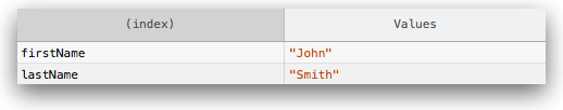 Первая колонка таблицы будет озаглавлена как (index). Если data представлена массивом, тогда значения первой колонки будут представлять индексы массива. Если data- объект, тогда значения первой колонки будут представлять свойства объекта.